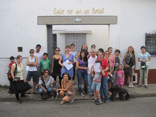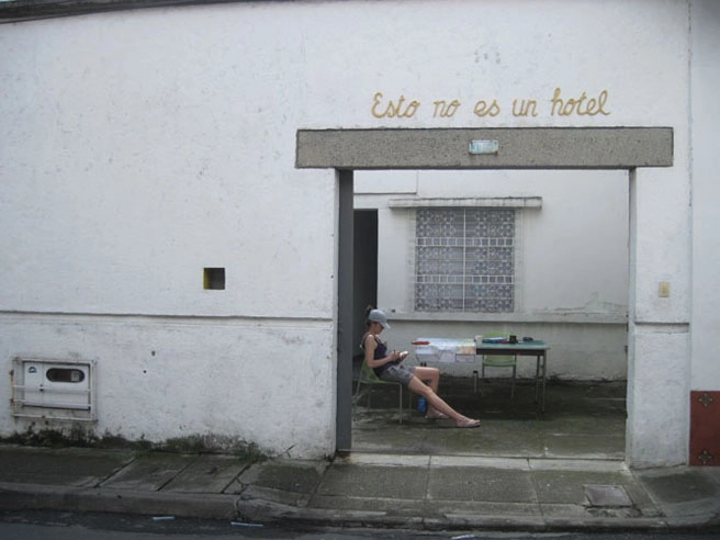 La obra surge a partir de interrogarnos por la definición del lugar que habitábamos durante nuestra estadía en Cali. Como primer gesto, colocamos en la fachada de nuestra casa un letrero con la frase “Esto no es un hotel” y, a partir de allí, invitamos a los vecinos del barrio a reflexionar sobre cómo definirían sus propios hogares.